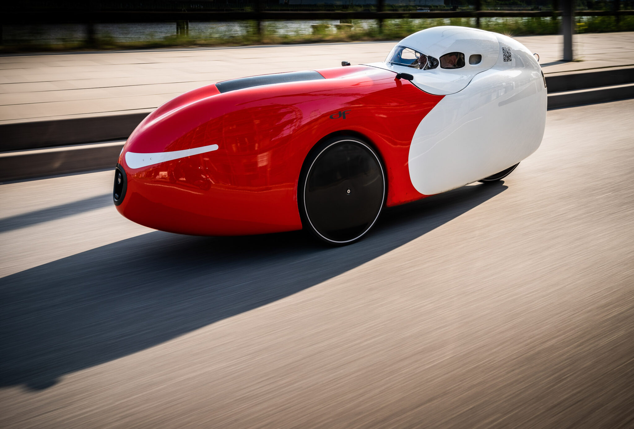 Das ist ein Fahrrad. Es hat drei Speichenräder, es hat Pedale und einen bequemen Sitz. Durch die Verkleidung sieht es ein bisschen aus wie ein kleines Auto, aber es hat keinen Motor, also ist es rechtlich ein Fahrrad.